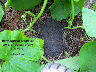 | Bury the base of the squash stems with compost and mulch with pine needles to keep squash borer moths away. | Then bury the vine at several additional places along its length. |
